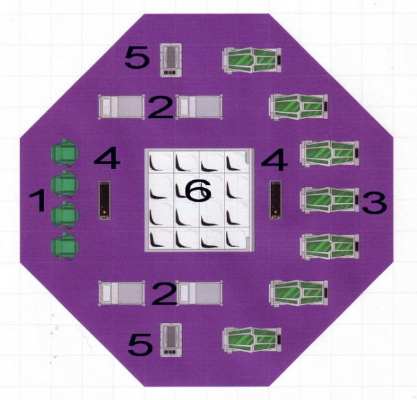 Each nest room has a door (2) which doubles as a teleport port to the control center, a