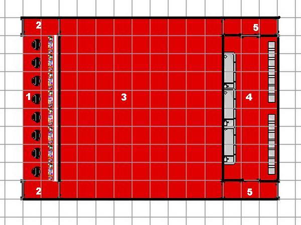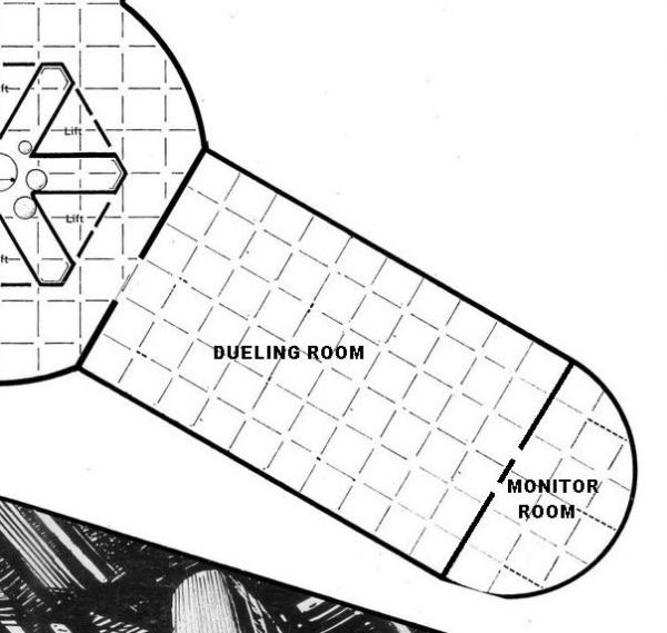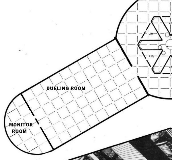 monitor room where the duel judges, a medic, & interested parties watch the action. The