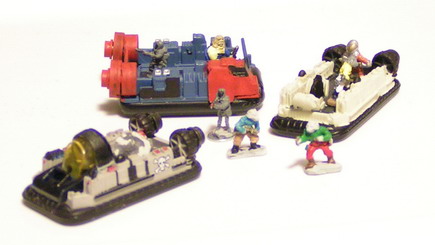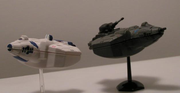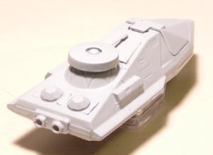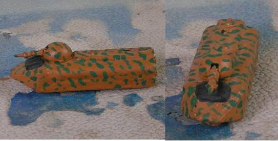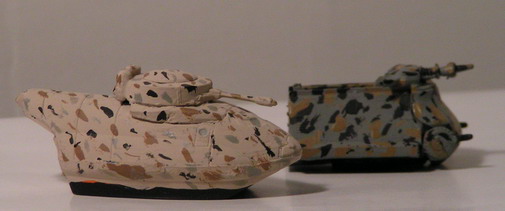 Two Aslan APC's. The left is a micromachine flying boat with the wings removed, turret from the