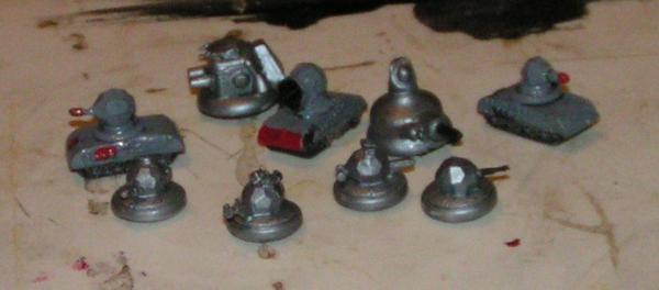 Several warbots. On the left, the bots are made from treads from my old Big Demolisher tank from