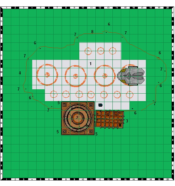 1. Landing Field. 2. Hotel Ermehahd. 3. Santanna Engineering Station. 4. Entrance to internal